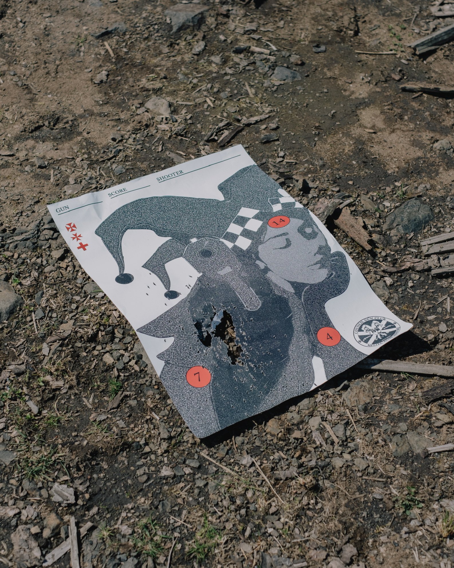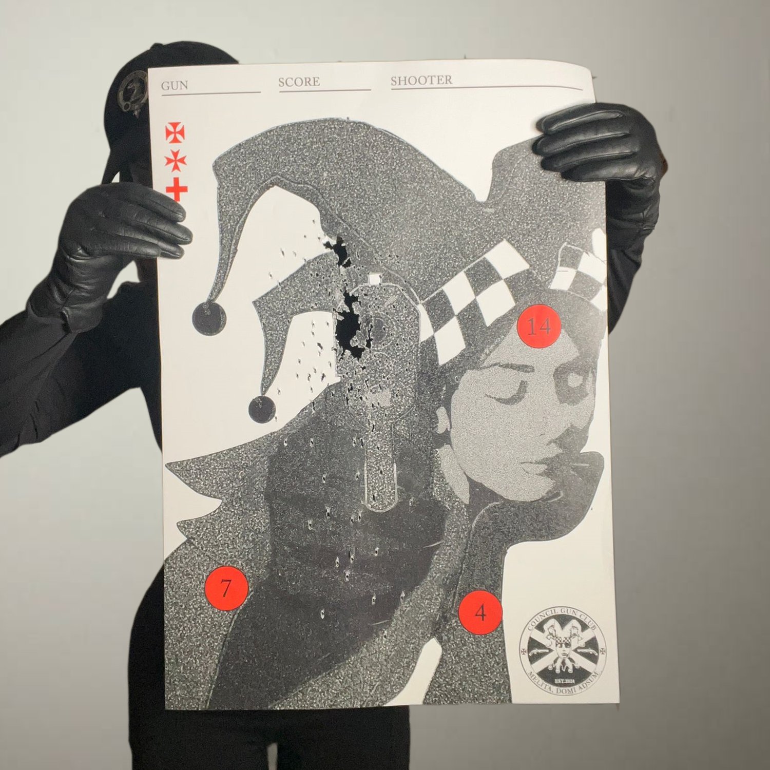 Target Print shot with a Greener GP Martini Action Shotgun in Ayrshire, Scotland. Part of 'He's a Good Man, He Doesn't Hit Me' raising awareness of domestic abuse in Scotland. All profits go to Glasgow Women's Aid. A2 (42cm x 59.4cm).